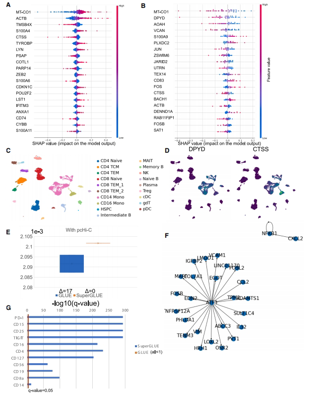 "SuperGLUE facilities explainability for multi-modal data analysis":通过SHAP值成功鉴定CD14 Mono细胞标记基因DPYD等,其预测性能显著优于随机基因集;图扰动检验发现的基因-蛋白相互作用与实验证据高度吻合。