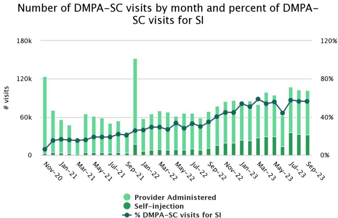 数据分析显示DMPA-SC使用量呈持续增长(图1),2020年11月至2023年9月SI访问量增长超300%。这种跃升背后是系列政策创新:2011年国家食品药品管理局(NAFDAC)首次批准DMPA-SC,2016年扩展SI适应症标签,2019年将之纳入国家基本药物目录。尤为关键的是任务转移与分担(Task-Shifting and Task-Sharing, TSTS)政策修订,允许社区健康推广工作者(CHEWs)培训妇女自我注射,打破专业医护垄断。