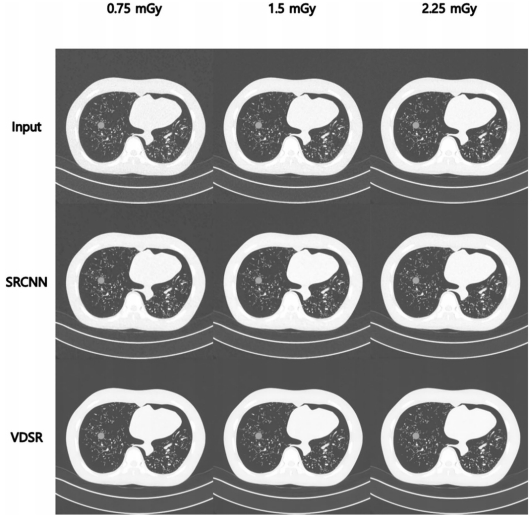 视觉评估显示,两种模型均能有效抑制噪声并增强血管纹理。尤其在0.75mGy剂量下,VDSR模型对支气管壁结构的重建效果显著优于原始低剂量图像。
