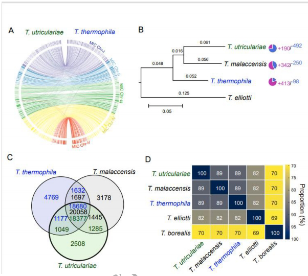 染色体级别基因组显示T. utriculariae存在2,508个特有基因,显著富集于生物互作(biotic interactions)和碳水化合物代谢通路。比较基因组分析发现其线粒体基因组(51,725 bp)较近缘种扩大15%,核基因组编码的线粒体蛋白进化速率提升1.8倍。透射电镜捕捉到共生状态下线粒体形态从圆形变为细长结构,并与围藻液泡(perialgal vacuole)膜紧密接触。