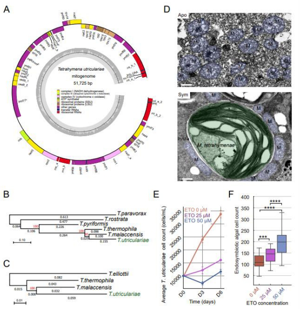 本研究揭示了淡水纤毛虫Tetrahymena utriculariae与其内共生绿藻Micractinium tetrahymenae在初期内共生阶段的动态互作机制。通过比较基因组学和转录组学分析,发现宿主线粒体基因加速进化,共生状态下线粒体形态重塑并与共生体紧密互作。研究证实脂肪酸氧化抑制会降低宿主适应性但增加共生体数量,且内共生藻类光合作用相关基因下调伴随叶绿素含量减少。该成果发表于The ISME Journal,为理解内共生关系从寄生向互利转变的环境驱动机制提供了新视角。