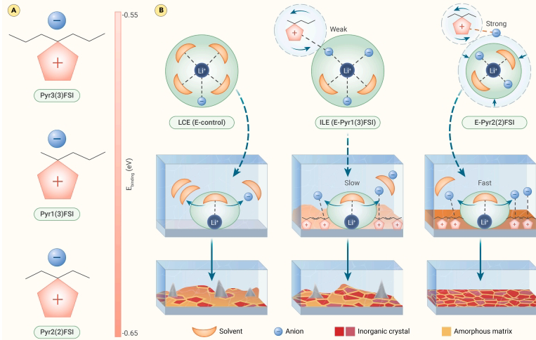 为突破这些瓶颈,郑州大学和香港城市大学联合团队在《The Innovation》发表创新研究,提出"对称分子设计"新范式。研究团队采用多学科交叉方法:通过密度泛函理论(DFT)计算筛选对称分子Pyr2(2)FSI(结合能-0.65 eV);借助冷冻透射电镜(cryo-TEM)解析SEI纳米结构;结合核磁共振(NMR)和拉曼光谱分析Li+溶剂化结构;采用Vogel-Tammann-Fulcher(VTF)模型计算离子传输活化能;并建立机器学习预测框架优化分子设计。