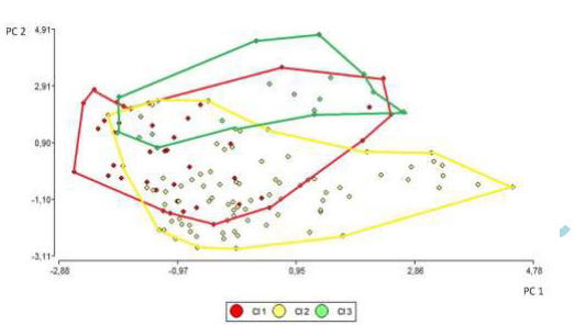 生产力比较显示,Cl 3的C/100c达85头,显著高于Cl 1的76头(P=0.0233),但三组在C/100ha上无统计学差异。PCA分析(图1)显示Cl 3在右上象限形成独立集群,与外部劳动力供给(r=0.81)和犊牛免疫程序(r=0.42)等变量强相关。
