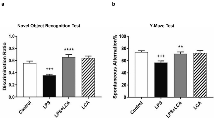行为学测试显示,LPS处理显著损害小鼠的新物体识别能力( discrimination ratio降低)和空间工作记忆( spontaneous alternation%下降)。而LCA治疗(20 mg/kg)可显著逆转这些认知缺陷,使NOR测试中的辨别比和Y迷宫中的自发交替百分比恢复至接近正常水平。值得注意的是,单独使用LCA对健康小鼠的认知功能无显著影响,表明其作用具有神经炎症特异性。