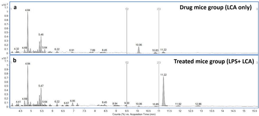 通过建立的GC-MS/MS方法,首次在脑组织中检测到LCA的存在。在LPS预处理的神经炎症小鼠中,LCA的脑组织浓度(143.68±24.82μg/mg)显著高于正常小鼠(29.07±7.58μg/mg),证实神经炎症可增强BBB对LCA的通透性。这一发现为理解LCA在病理条件下的分布特性提供了直接证据。