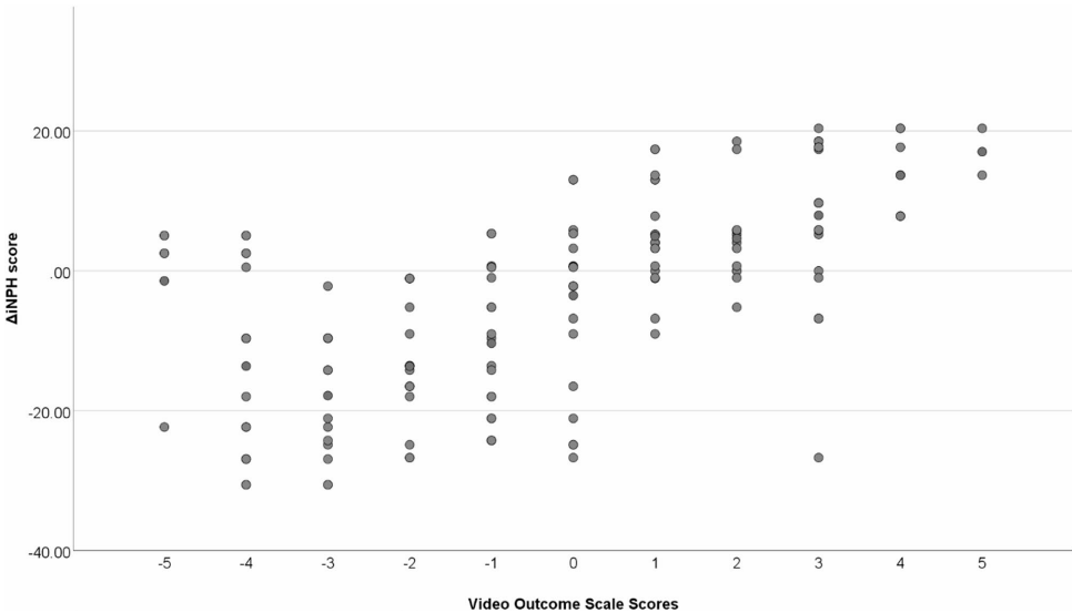 为破解这些难题,瑞典乌普萨拉大学的Maria Ekblom团队在《Fluids and Barriers of the CNS》发表创新研究。团队采用前瞻性队列设计,纳入2019-2023年间39例确诊iNPH并行分流术的患者(平均75.5岁)。关键技术包括:双盲视频记录术前术后Timed Up and Go(TUG)测试;4名专业评估者使用Hellstrom量表中的序贯步态量表(1-8级)和自研11级视频结局量表(-5至+5)独立评分;采用Krippendorff's α检验评估者间一致性;通过Spearman's ρ分析步态改善与Hellstrom量表、EQ-VAS评分的相关性。