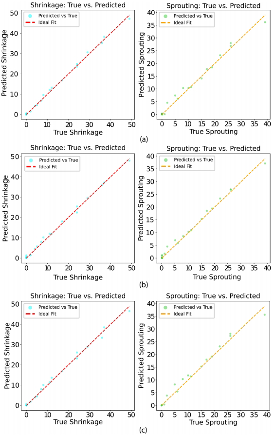 PFI分析揭示贮藏时间对收缩(重要性得分0.978)和发芽(0.581)的主导作用。温度次之(收缩0.047,发芽0.070),而维生素C含量对发芽预测的影响(0.145)是收缩(0.081)的1.8倍。值得注意的是,糖分含量在XGBoost模型中贡献度最低,这与传统化学动力学模型的认知形成有趣对比。