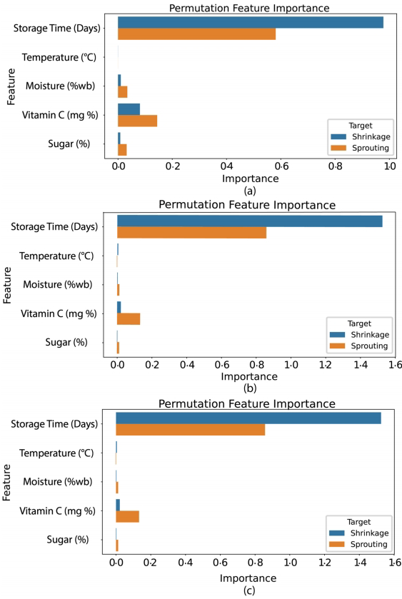 关键技术方法包括:1) 定制化ECS系统监测环境参数与营养指标;2) 基于Likert量表(0-5)的收缩量化评估;3) 十折交叉验证结合排列特征重要性(PFI)分析;4) 多输出回归处理收缩与发芽的关联预测。研究团队特别开发了包含StandardScaler数据标准化和贝叶斯超参数优化的机器学习管道,所有实验数据均来自 Sylhet 地区的实际贮藏场景。