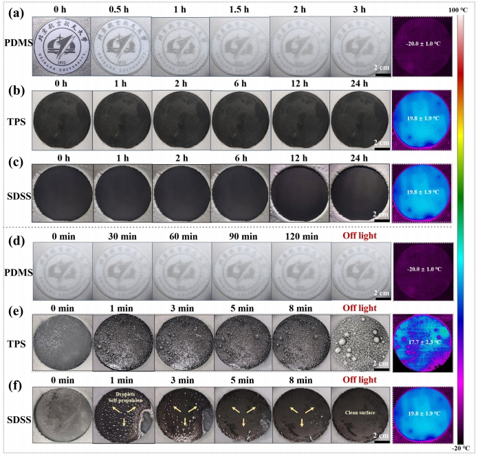 SDSS在1 sun光照下表面温度达19.8±2.2°C(环境-20°C),超滑表面使水滴滑动角仅2.8±0.6°。对比传统光热表面(TPS),10 μL冷滴(0°C)可在水平SDSS上自发移动至边缘。
