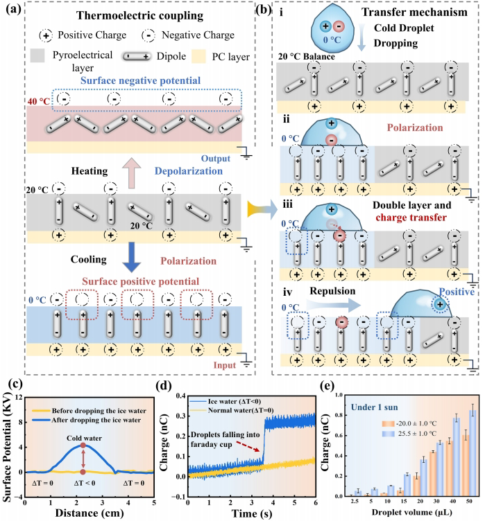 研究团队通过旋涂法构建三明治结构:顶层为硅油浸润的PDMS超滑膜(50 μm),中层为透明锂铌酸锂单晶(LN,500 μm),底层为碳纳米管复合PDMS光热层(600 μm)。采用静电电压表测量表面电势,法拉第杯量化液滴携带电荷,数字力计测试冰粘附强度,并在-20°C/80%RH环境中模拟极端条件。