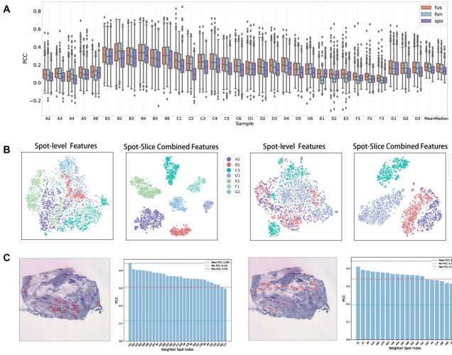 全局特征整合:通过t-SNE可视化证实,融合切片级全局特征后,不同切片斑点特征呈现更清晰的边界(图4B),解决了切片间异质性难题。