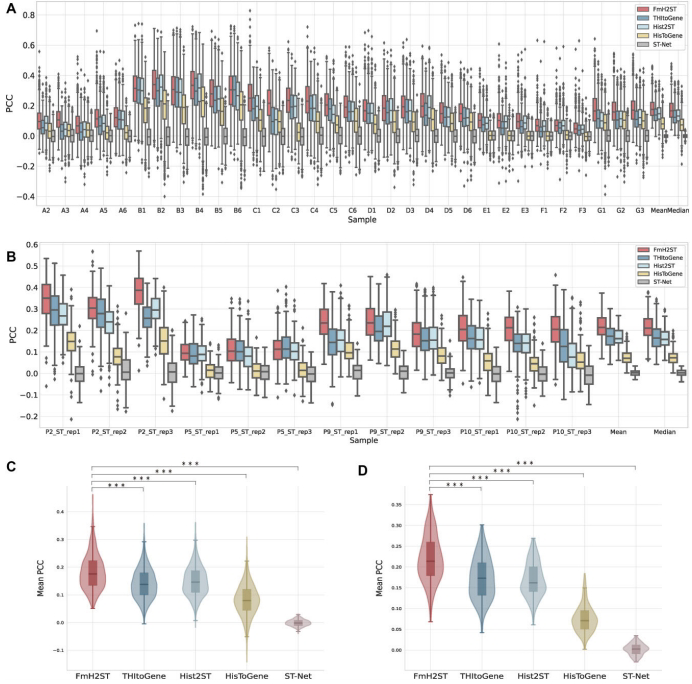 在HER2+和cSCC数据集上,FmH2ST的Pearson相关系数(PCC)分别比最优基线方法THItoGene提高33.8%和28.4%(图3)。特别在难例样本(如患者G的G1-G3切片)中,基础模型分支通过外部先验知识显著提升预测稳定性。
