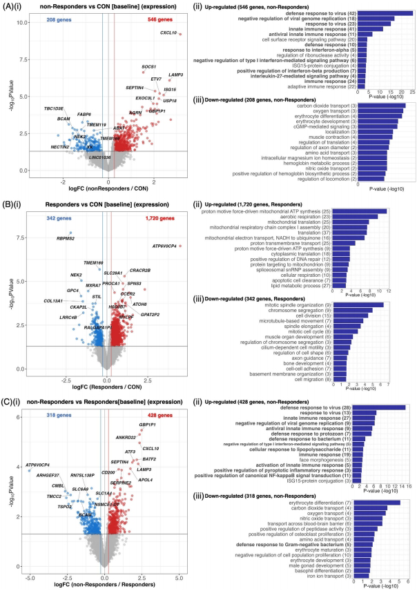 通过比较基线转录组,非响应者显著富集于干扰素信号通路(如CXCL10、IDO1)和病毒防御相关基因,其上调基因数量是响应者的3倍(546 vs 1720)。