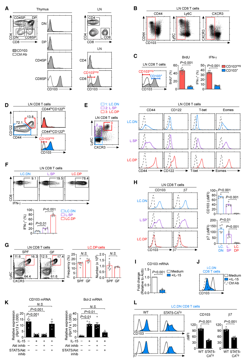通过流式分析发现,初始CD8+ T细胞(LC.DN亚群)高表达CD103,而记忆表型细胞(LC.DP)则逐渐下调CD103。这种表达变化与细胞分化状态密切相关,CD103neg细胞表现出更强的增殖能力和IFN-γ产生能力。