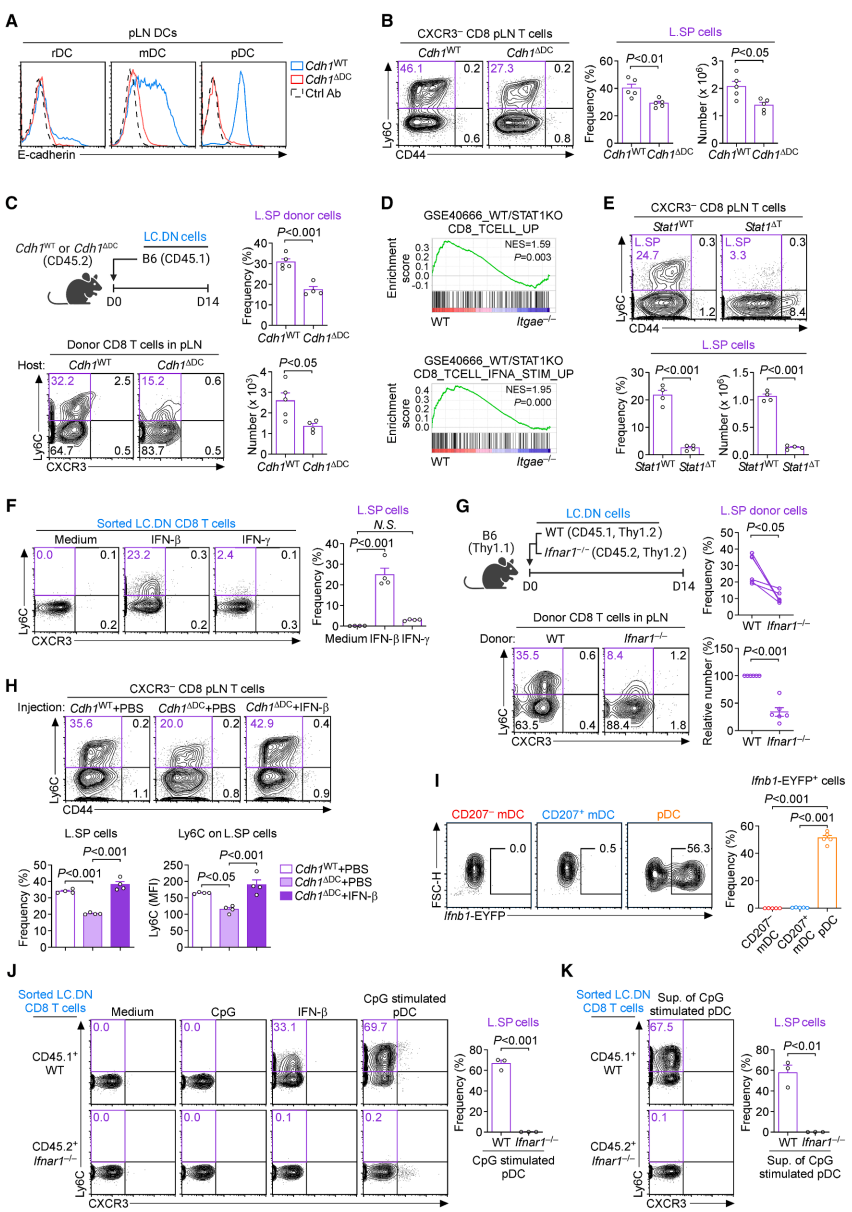 DC特异性缺失E-cadherin(Cdh1ΔDC)导致L.SP细胞减少,而IFN-β处理可挽救这一缺陷。Ifnar1-/- T细胞在过继转移实验中表现出分化障碍。