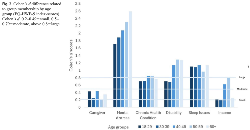 量表成功区分所有预设群体:照护者(d=-0.40)、心理困扰者(d=-2.15)、慢性病患者(d=-0.50)、残疾人群(d=-0.61)和睡眠问题者(d=-1.21)。低收入群体仅在加权指数得分中显现差异(d=0.18),揭示权重体系对经济因素敏感性的影响。