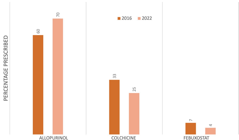 治疗模式:别嘌呤醇是最常用降尿酸药物(ULT),使用率从2016年60%升至2022年70%,而非布司他使用率从7%降至4%。79%痛风患者接受ULT治疗,但仅24%曾就诊风湿科。