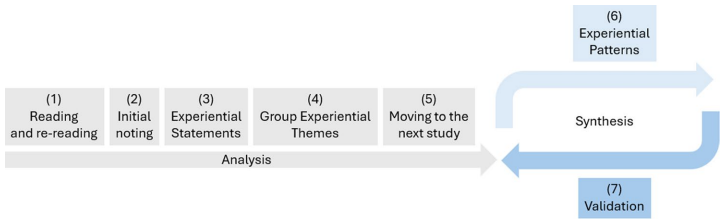 分析过程遵循IPA步骤,适应元综合环境:从反复阅读到初步注释,构建体验陈述,寻找联系并发展群体体验主题(GETs),最后识别跨研究的体验模式(EPs)。整个过程采用三重诠释学方法,强调对元综合者预设的反思。