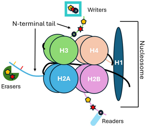 每种HPTM由“写入器”、“擦除器”和“读取器”的动态相互作用维持[13]。例如,H3K27me3水平由EZH2(组蛋白甲基转移酶-写入器)和KDM6(组蛋白赖氨酸去甲基化酶-擦除器)的相反功能决定[14]。EED“读取器”结合H3K27me3并促进其他表观遗传因子的活性,从而控制基因表达[15]。“写入器”、“读取器”和“擦除器”的功能总结于(图1)。