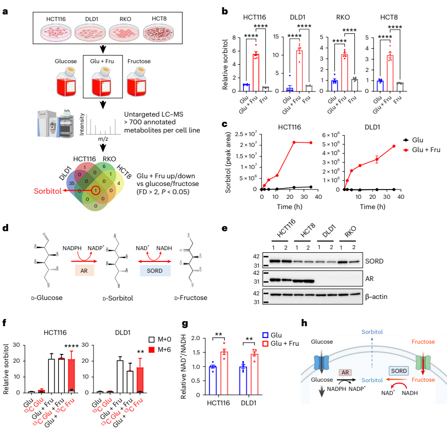 代谢组学分析发现,Glu+Fru处理条件下山梨醇(sorbitol)水平在所有细胞系中均显著升高(3-11倍)。稳定同位素标记实验证实山梨醇主要来源于果糖而非葡萄糖,并通过山梨醇脱氢酶(SORD)反向反应生成。该反应伴随NAD+/NADH比值升高,而SORD在结直肠癌肿瘤组织中表达显著上调,尤其在干细胞样肿瘤细胞中高表达。