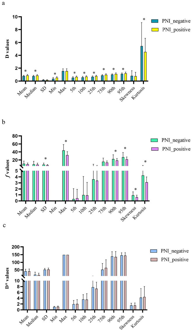 D值的均值、中位数、最小值及各百分位数(5th、10th等)在PNI阳性组显著较高(p<0.05),而峰度较低(p=0.028)。f值的SD、最大值、90th、95th、偏度和峰度在PNI阳性组显著较低(p<0.05)。D*值无显著差异。