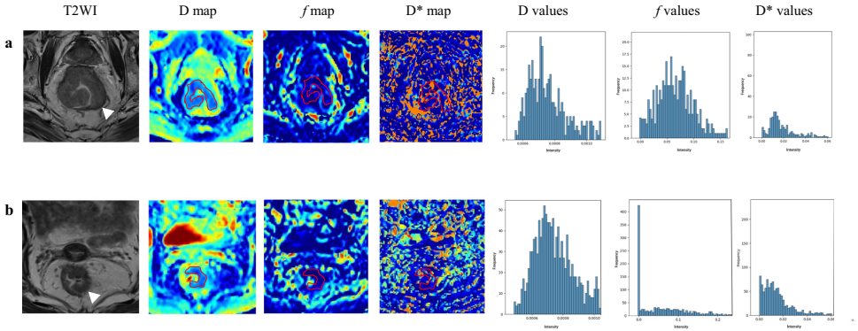 常规MRI在直肠癌分期和再分期中应用广泛,但其提供的PNI状态信息有限。扩散加权成像(DWI)通过评估水分子扩散运动来表征生物组织特性,并可量化表观扩散系数(ADC),但由于无法区分血流灌注与真实水分子扩散,在复杂肿瘤微环境评估中价值有限。体素内不相干运动(Intravoxel Incoherent Motion, IVIM)技术的出现为解决这一难题提供了新思路。它通过多b值采样和双指数曲线拟合分析,能够区分灌注效应(在低b值范围测量)和真实扩散效应(在高b值范围测量)。在低b值(<200 s/mm2)下,微血管体积分数(f)和伪扩散系数(D*)可评估灌注特性;在高b值(≥200-1000 s/mm2)下,真实扩散系数(D)可反映与组织细胞结构相关的真实水分子扩散。近年来,直方图分析作为基于像素分布的定量标志物,在评估肿瘤特性方面展现出独特优势。