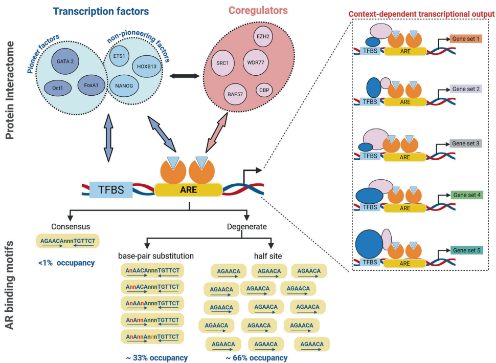 这些发现以及显示AR相关转录因子参与建立恶性AR cistrome并执行其对CaP细胞行为影响的发现,突出了AR相互作用蛋白在AREs控制基因的转录调控中的重要作用。已有数百种此类蛋白被报道。除了识别AREs附近结合位点的转录因子和非DNA相互作用的共调节因子(coregulators)外,这个相互作用组还包含先驱转录因子(pioneering transcription factors)(如FOXA、OCT和GATA家族成员),它们促进染色质可及性,使得AR能够结合AREs。