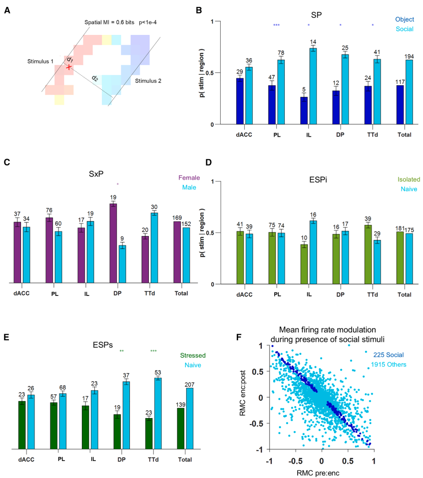 研究人员运用了多项关键技术:首先,通过Neuropixels 1.0探针植入技术,同步记录小鼠PFC五个亚区(dACC、PL、IL、DP、TTd)的单神经元活动;其次,采用四种社会行为范式(社会偏好SP、性别偏好SxP、情绪状态偏好ESPi和ESPs任务),创设不同社会情境;第三,利用DeepLabCut进行无标记位姿估计,精确追踪动物行为;最后,通过互信息(MI)计算和ISI置换检验等统计方法,量化神经元的社会与空间编码特性。