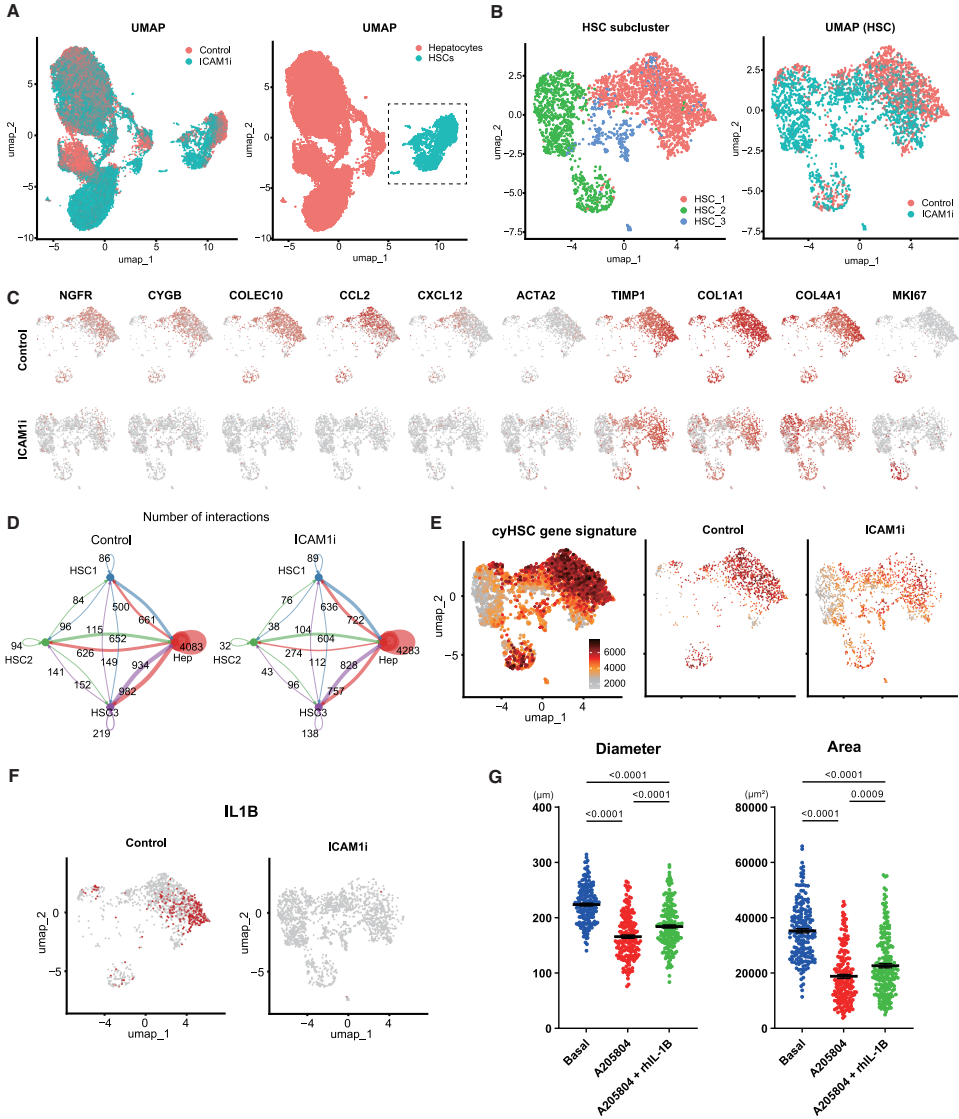 单细胞RNA测序分析发现,iHSOs中的HSCs可分为三个亚群:细胞因子富集型HSC(HSC_1)、增殖型HSC(HSC_2)和标志物低表达型HSC(HSC_3)。ICAM-1抑制处理后,肝细胞与HSC亚群间的相互作用减少,cyHSC特征富集度下降,IL-1β表达降低。添加IL-1β可部分逆转ICAM-1抑制导致的生长抑制,而IL-1β抑制剂则抑制iHSOs生长,表明ICAM-1通过调控IL-1β表达促进肝细胞增殖。