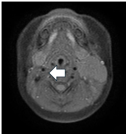 为了进一步评估,研究人员在深度镇静下为患儿进行了颈部磁共振成像(MRI)增强检查。MRI显示一个3×2.5×2厘米的肿块,在T1加权图像上呈等信号,在T2加权图像上呈稍高信号。