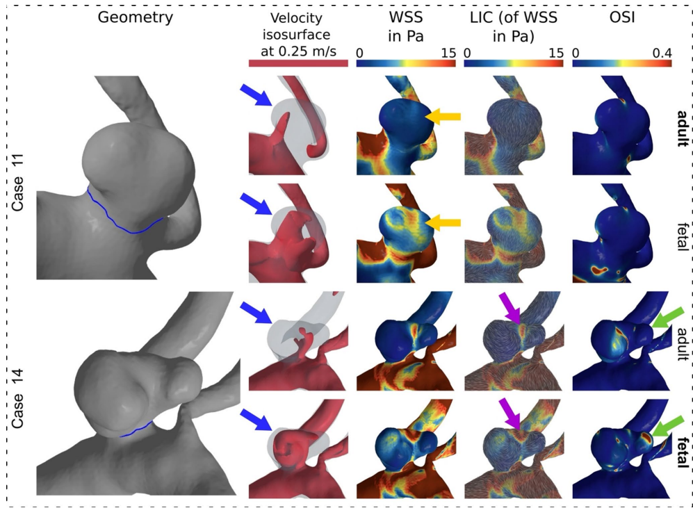定性结果显示,fPCOM配置下,动脉瘤内流速超过0.25 m/s的区域比例更大,壁面剪切应力(WSS)在高速区域显著增加。案例11显示动脉瘤内WSS全局性强烈增加,而案例14则表现为动脉瘤穹顶中心区域的高幅度空间分布更加明显。WSS线积分卷积(WSS LIC)在胎儿型变体中显示出不同的模式,振荡剪切指数(OSI)在两种配置中也呈现不同的空间分布特征。