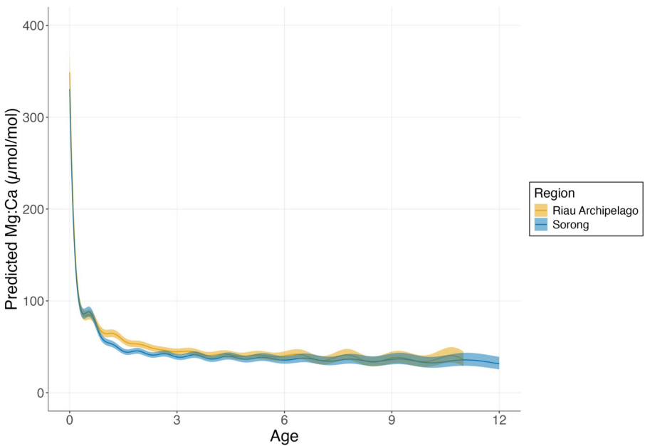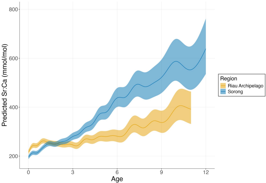 Sr:Ca的最佳模型(Model 1d)显示,年龄与Sr:Ca呈正非线性关系,共享和区域特异性年龄平滑项表明尽管地理隔离,Sr调控的系统发育过程在区域间保持一致。廖内群岛样本早期Sr:Ca较高,随后下降再上升,而索龙样本则随年龄持续增加,反映环境盐度波动和生理过程的交互影响。