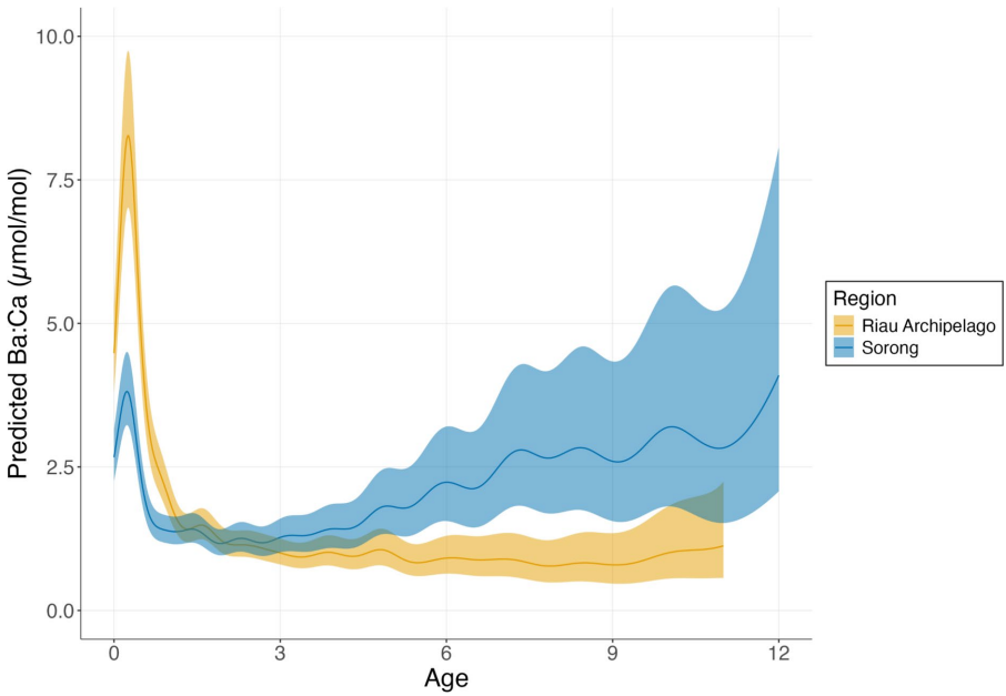 Ba:Ca模式(Model 1e)显示区域特异性年龄差异,廖内群岛样本早期Ba:Ca高后下降并稳定,索龙样本初始低后增加,可能与河口洪水事件和栖息地使用相关,表明环境Ba可用性和 ontogenetic 迁移的影响。