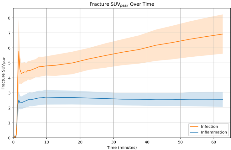 研究人员采用长轴视野(Long Axial Field-of-View, LAFOV)PET/CT系统,对31例疑似FRI患者(共33处骨折)进行了65分钟的动态采集。通过对比分析感染组与炎症组的代谢动力学特征,发现感染灶表现为持续上升的[18F]FDG摄取曲线,而炎症组织则呈现平台期特征。这种差异源于感染过程中微生物持续代谢和免疫细胞活化带来的持续葡萄糖消耗,与单纯炎症反应的代谢模式存在本质区别。