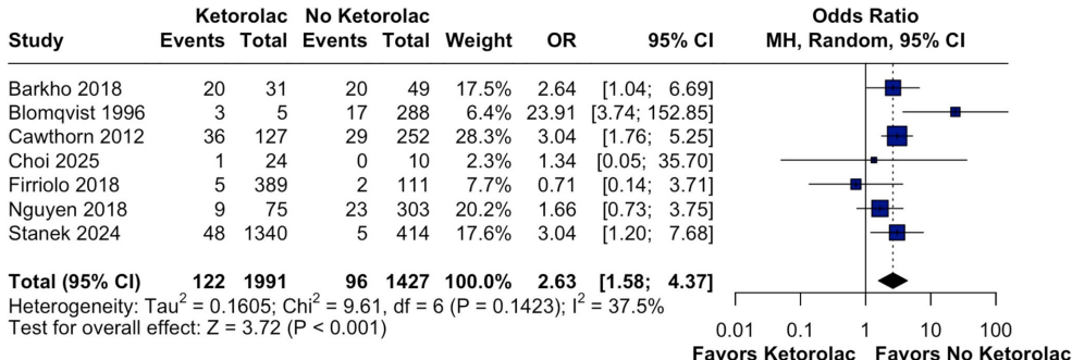 共纳入7项研究(6项观察性研究,1项随机对照试验),涵盖3418例患者,其中酮咯酸组1991例,对照组1427例。总体血肿发生率在酮咯酸组为6.13%,对照组为6.73%。荟萃分析显示,酮咯酸显著增加血肿风险(OR 2.63, 95% CI 1.58-4.37, p<0.001, I2=37.5%)。亚组分析表明,保守治疗的血肿风险升高更为明显(OR 2.72, 95% CI 1.37-5.38, p=0.004),而需再次手术的血肿风险虽呈上升趋势(OR 2.20, 95% CI 0.98-4.90, p=0.055),但未达统计学显著性。