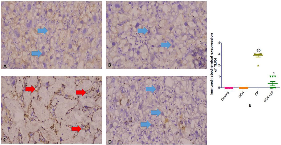 CP组TLR4与FOXO1免疫表达显著增强(评分3分),OCA干预后表达强度显著降低(接近阴性),进一步验证OCA对TLR4/FOXO1信号通路的抑制作用。