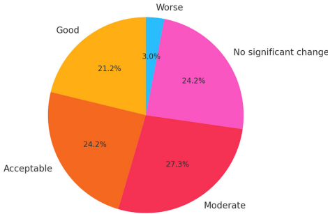 早期结果以饼图形式展示,21%良好、24%可接受、27%中等、24%无变化、3%恶化,表明尽管条件艰苦,多数患者仍从手术中获益。