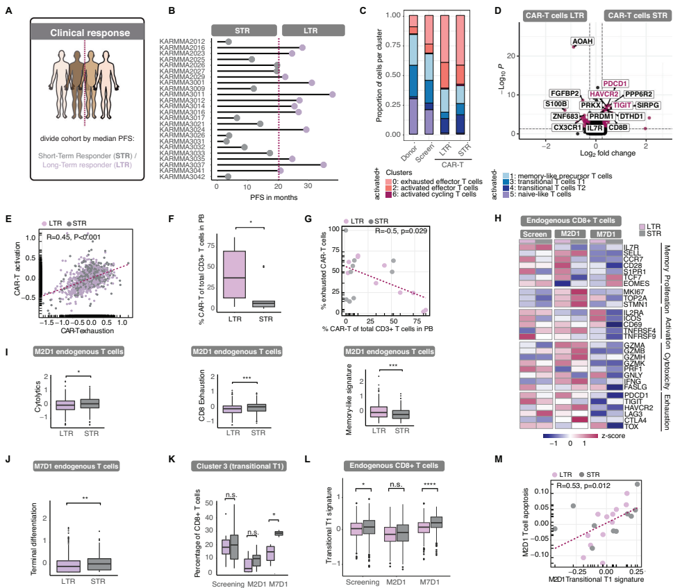按无进展生存期(PFS)将患者分为长期应答者(LTR)和短期应答者(STR)后发现,STR的CAR-T细胞高表达耗竭(PD-1、TIM3、TIGIT)和凋亡标志物,而LTR则显示记忆相关基因高表达。CAR-T细胞持久性与低耗竭水平显著相关。
