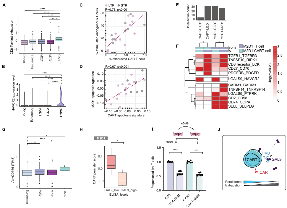 研究鉴定出TIM3(在CAR-T细胞上高表达)与其配体GAL9之间的相互作用是关键免疫抑制机制。血清GAL9水平与CAR-T细胞持久性基因表达呈负相关。体外实验证实GAL9处理可降低CAR-T和未转导T细胞的活力,而GAL9阻断抗体可部分恢复活力。