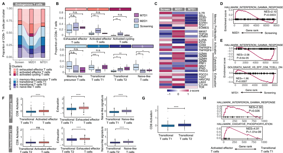 研究发现内源性CD8+ T细胞的激活在M2D1时达到峰值但到M7D1时回归基线,而na?ve样T细胞持续耗竭。过渡性T细胞亚群(T1和T2)呈现动态变化:T1先降后升,T2持续增加。这些过渡细胞状态表达低水平的激活、耗竭和na?ve标志物,代表中间状态。