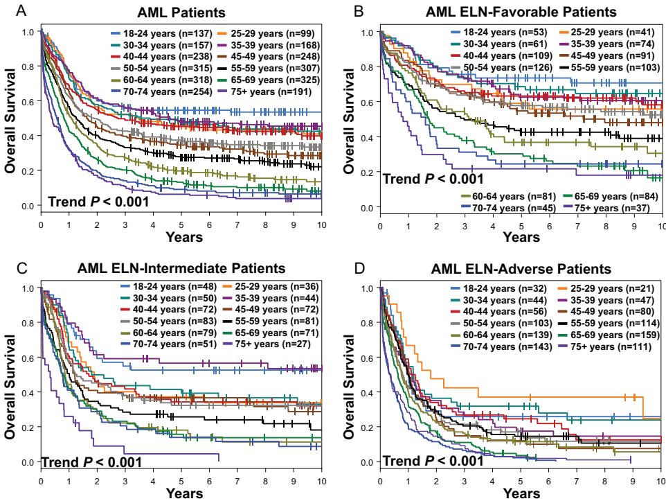 在2022 ELN favorable遗传风险患者中,估计5年存活率从75岁及以上患者的21%到最年轻患者(18-24岁)的73%不等。2022 ELN intermediate遗传风险患者也遵循这种生存模式,≥75岁患者的5年OS率为4%,而18-24岁患者为53%。在2022 ELN adverse遗传风险患者中,变异性较小,70-74岁患者的最低5年OS率为2%,而25-29岁患者的最高5年OS率为37%。