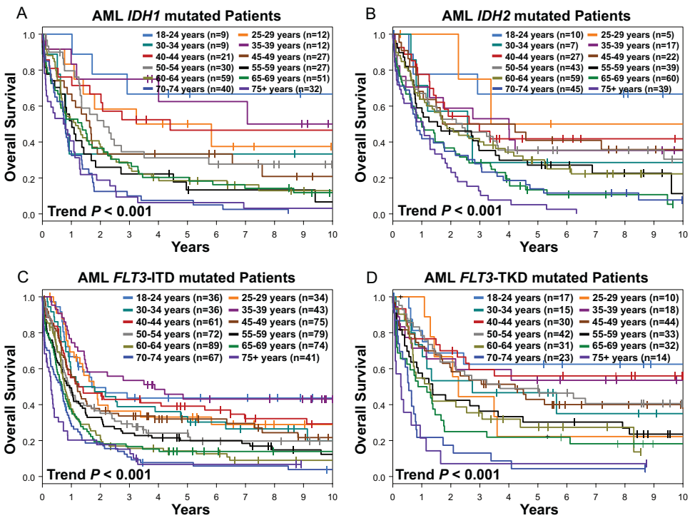 研究人员评估了年龄对携带特定复发AML相关基因突变患者结局的影响,重点关注已有获批靶向抑制剂的突变,包括IDH1和IDH2基因突变、FLT3-ITD和FLT3-TKD。