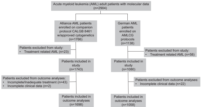 研究采用了几项关键技术方法:收集了1986-2017年间2823例初治AML(非急性早幼粒细胞白血病)患者的临床数据,这些患者来自美国和德国的多个医疗中心;通过靶向测序平台检测了24个共享的AML相关基因突变,使用≥2%的变异等位基因频率(VAF)作为 cutoff值;采用细胞遗传学分析预处理骨髓/血液样本,并经中心核型审查确认;使用Kaplan-Meier法计算总生存期(OS),Cox比例风险模型估计风险比(HR),统计分析由Alliance统计与数据管理中心完成。