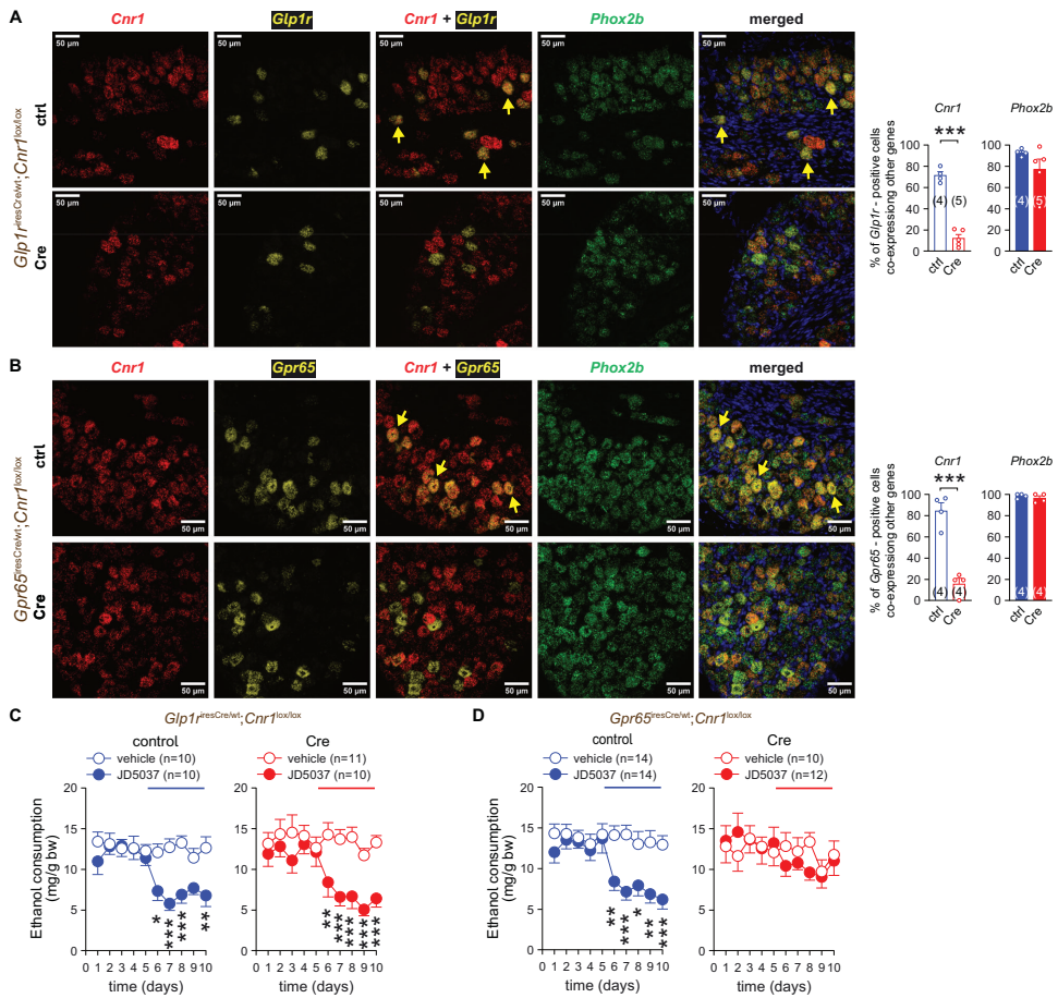 本研究发表于《Molecular Psychiatry》,为了深入探索上述问题,研究人员运用了多种关键技术方法。研究使用转基因小鼠模型,包括组织特异性敲除CB1R或Ghsr的小鼠(如GhrlCre;Cnr1lox/lox、Phox2bCre;Cnr1lox/lox、Gpr65iresCre;Cnr1lox/lox等),通过PCR和RNAscope荧光原位杂交(FISH)进行基因型和表达验证。行为学实验采用两瓶选择测试(two-bottle choice test)和暗饮范式(drinking in the dark paradigm),评估乙醇摄入量。药理学干预使用外周限制性CB1R拮抗剂JD5037和MRI-1891(包括其S和R对映体),以及Ghsr拮抗剂PF-5190457,通过口服灌胃给药。分子生物学技术包括定量实时PCR(qRT-PCR)检测基因表达,液相色谱-串联质谱(LC-MS/MS)测量内源性大麻素水平,酶联免疫吸附测定(ELISA)检测血浆ghrelin浓度。此外,还通过皂草素(saporin)偶联CB1R抗体进行结节状节神经元选择性消融,以及他莫昔芬诱导的Cre重组酶系统实现特异性基因敲除。所有动物实验均遵循美国政府法规和国立卫生研究院(NIH)动物护理和使用委员会(IACUC)的伦理指南。