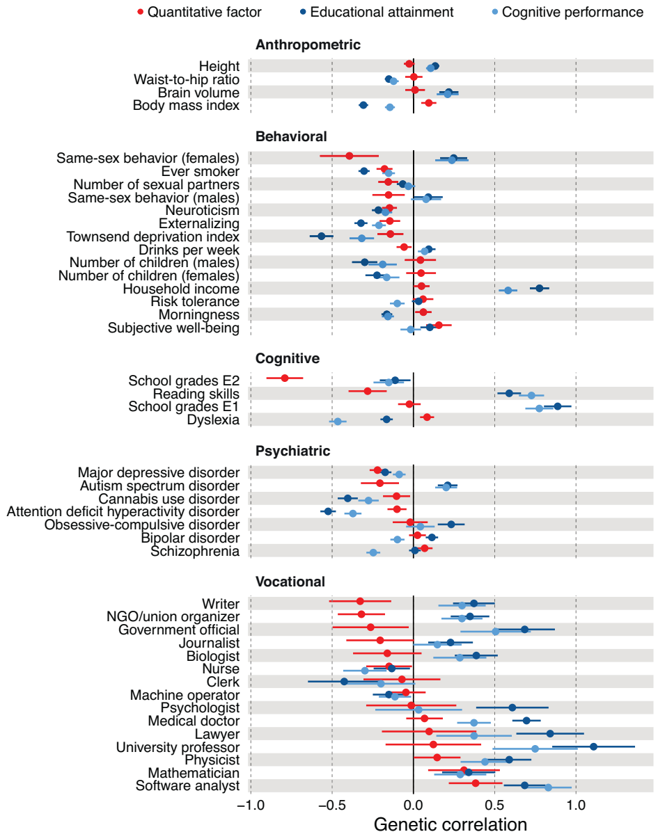 数量因子与学业成绩第一主成分(一般学业能力)无遗传相关(rg=-0.02),但与第二主成分(语言-数学差异轴)呈高度负相关(rg=-0.80)。职业分析显示其与数学家(rg=0.31)和程序员(rg=0.38)正相关,与作家(rg=-0.32)负相关。精神疾病方面,与ADHD(rg=-0.10)、外化行为通用因子(rg=-0.14)、神经质(rg=-0.14)和抑郁症(rg=-0.22)均呈负相关,与自闭症谱系障碍也显示负相关(rg=-0.20),但与精神分裂症存在微弱正相关(rg=0.07)。