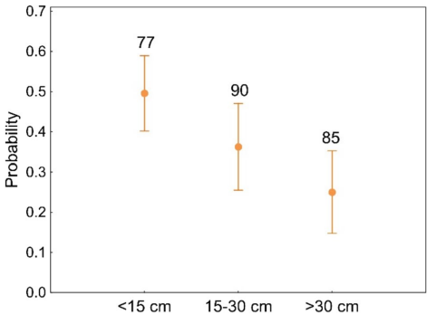 中斑啄木鸟的取食技术则取决于取食点直径和状态:啄击概率随直径增大而降低(Fig.5),且在死树部位更高(Table 4)。