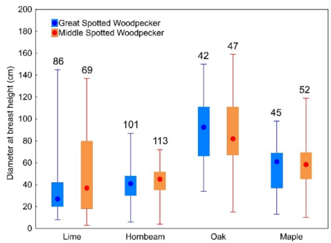 波兰比亚沃维耶扎国家公园大斑啄木鸟与中斑啄木鸟繁殖季觅食行为生态位分化研究:以树种选择和取食技术差异揭示竞争共存机制