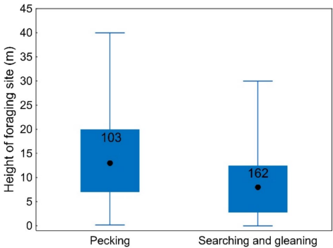 研究采用野外直接观察法,在波兰比亚沃维耶扎国家公园10平方公里橡树-椴树-鹅耳枙林内,于繁殖季(4-6月)无雨雪强风日进行系统观测。记录树种、树木状态(活/死)、取食部位状态(活/死)、树木部位(树干/树枝)、胸径(DBH)、取食点直径(分<15cm/15-30cm/>30cm三级)及取食高度(用测高仪或身高参照估算)。取食技术分三类:搜寻拾取(表面采食)、啄击(啄凿提取)和环啄吸汁(钻孔吸汁兼食诱集昆虫)。采用广义线性模型(GLM)分析取食点位选择差异,G检验分析取食技术频率差异,统计工具为Statistica 13.0。