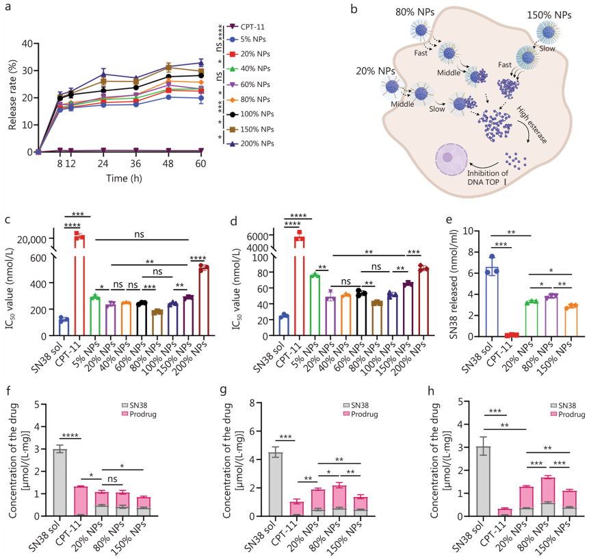 研究人员成功合成了C12桥连的SN38二聚体前药,其纯度超过99%。分子模拟表明,该前药相较于SN38单体具有更强的分子间结合能(-53.84 vs. -37.28 kcal/mol),表明其更强的自组装倾向。然而,单纯由前药自组装形成的纳米颗粒(0% NPs)稳定性差,被排除在后续研究之外。通过引入不同比例的DSPE-mPEG2k进行表面工程,制备了一系列PEG化水平的NPs(5%-200%)。表征结果显示,所有PEG化NPs均具有高载药量(>25%)和球形形态。粒径随PEG化水平增加而增大,200% NPs时组装体结构被破坏。稳定性测试表明,在生理条件(含30%胎牛血清的PBS)下,20%-80% NPs表现出良好的稳定性,而低PEG化(5%)和高PEG化(100%-200%)的NPs稳定性较差。离心破坏实验进一步证实,60%和80% NPs在机械应力下能保持最好的结构完整性。