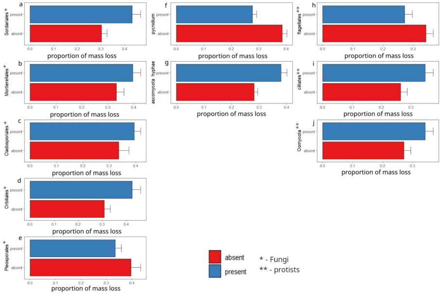 原生生物类群中,卵菌(Oomycota)和纤毛虫(ciliates)促进分解(分别带来7%和9%的质量损失增加),而鞭毛虫(flagellates)则抑制分解(8%的减少)。这种差异与其取食习性密切相关:纤毛虫主要取食真菌和卵菌孢子,间接促进了分解过程;而鞭毛虫以细菌为食,减少了主要分解者的数量。